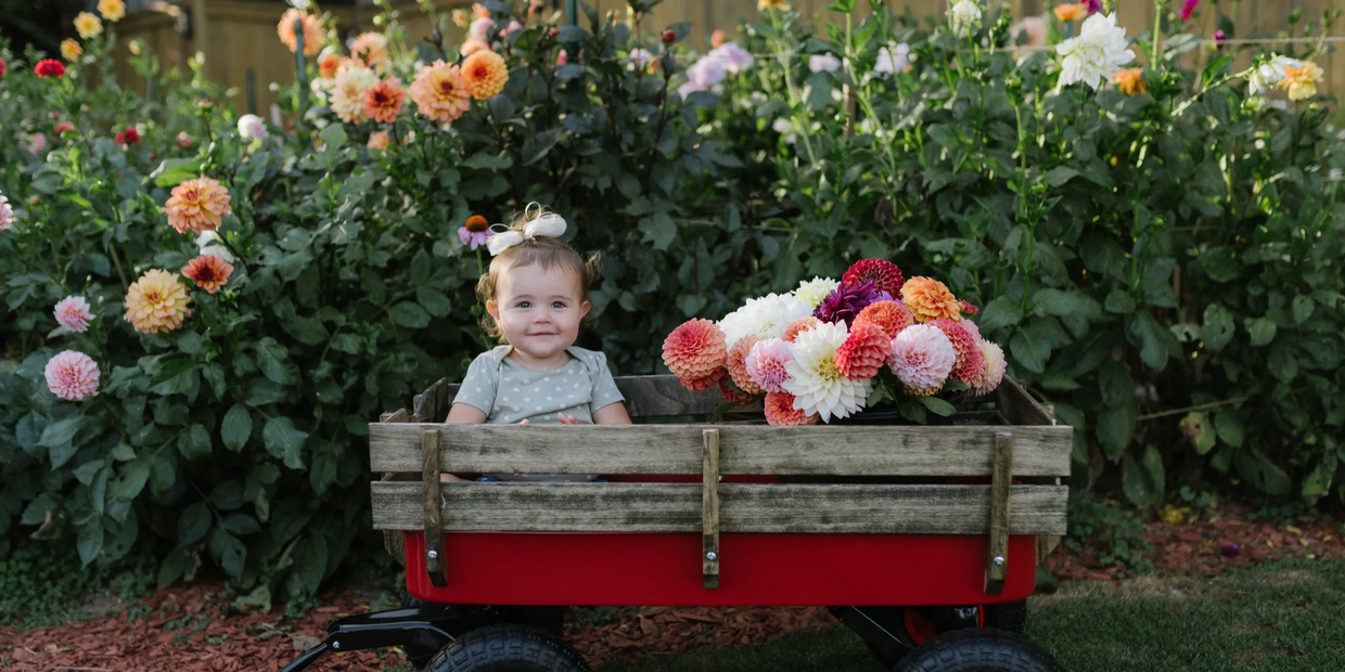 Hi and welcome to our page. We are Michael and Hailee Green, owners of Love Bug Gardens. Yes that little cutie in this picture is our baby girl, who we love so much. We are so excited you are here! We officially started this business in 2023 but we started growing flowers in 2018 as a hobby. The last few years our flower growing hobby has tripled and we now grow many different varieties of speciality flowers. We love to grow speciality flowers such as dahlias, ranunculus, sweet peas, sunflowers, zinnias, freesias as well as many other annual and perenial flowers. All nursery stock is grown locally on our private residence in Goleta, Ca. Something unique about us is that we grow what we sell, including filler flowers and greenery. We are blessed by what we grow and hope to offer our customers the best quality flower bouquets. That is why we aim to cut our flowers day of the scheduled pick up in order for you to get the most life out of your flower bouquet. We are very excited to be on this business adventure and look forward to meeting all returning, new and future customers.